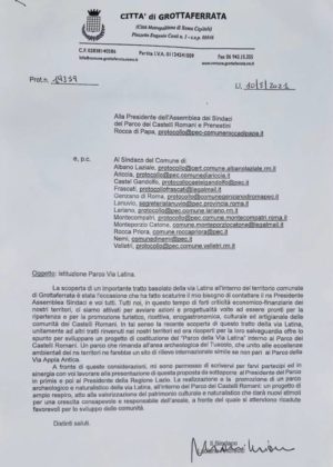 “A fronte di queste considerazioni – prosegue la missiva – mi sono permesso di scrivervi per farvi partecipi e in sinergia con voi lavorare alla presentazione di questa proposta da sottoporre al Presidente del Parco in primis e poi al Presidente della Regione Lazio. La realizzazione e la promozione di un parco archeologico e naturalistico della via Latina all’interno del Parco dei Castelli Romani: un progetto di ampio respiro, atto alla valorizzazione del patrimonio culturale e naturalistico che darà nuovi stimoli per una crescita consapevole e responsabile dell’areale, a fronte del quale si attendono ricadute favorevoli per lo sviluppo delle comunità””. Lo rende noto il Comune di Grottaferrata.