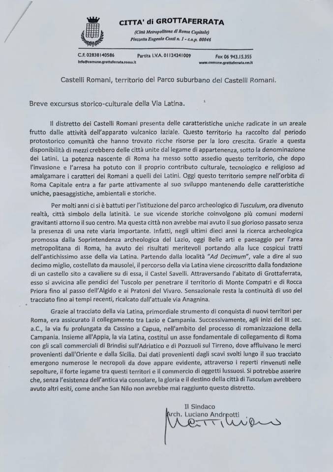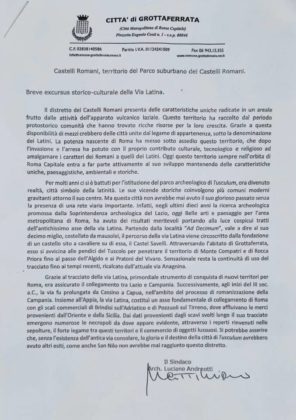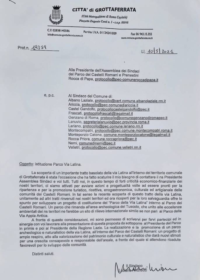 “La scoperta di un importante tratto basolato della via Latina all’interno del territorio comunale di Grottaferrata è stata l’occasione che ha fatto scaturire il mio bisogno di contattare il nostro presidente dell’Assemblea e voi tutti” scrive il sindaco Andreotti rivolgendosi ai colleghi primi cittadini dell’Assemblea dei sindaci del Parco dei Castelli Romani e Prenestini.
