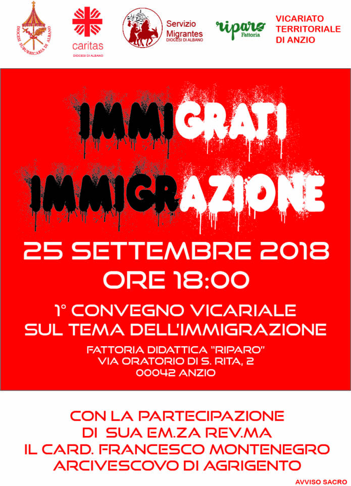 È in programma martedì 25 settembre, alle 18 presso le sale della Fattoria didattica “Riparo” di Anzio (via Oratorio di Santa Rita, 2) il convegno “Immigrati – immigrazione”, a cura della Caritas della diocesi di Albano, diretta da don Gabriele D’Annibale, in collaborazione con la fondazione Migrantes e il Vicariato territoriale di Anzio. Sarà l’occasione per affrontare un tema di stretta attualità, a partire dalla realtà vissuta sul territorio della diocesi di Albano, per poi allargare lo sguardo alla situazione nazionale e internazionale. Sarà presente l’arcivescovo metropolita di Agrigento, il cardinale Francesco Montenegro, presidente di Caritas italiana, che donerà la sua preziosa testimonianza. La dottoressa Rita Antonelli, referente della Caritas diocesana per le immigrazioni, illustrerà invece i dati di un report relativo all’attuale situazione dei migranti nella diocesi di Albano. «Il “Rapporto sul territorio 2017” presentato dall’Osservatorio delle povertà e delle risorse della diocesi di Albano all’inizio dell’estate ad Anzio – dice Rita Antonelli – ci dice che i cittadini stranieri nei tredici comuni della diocesi sono 51.670. Non basta però contabilizzare gli arrivi, non basta una politica che si limiti alla semplice gestione dell’esistente, spesso in modo emergenziale, occorre incamminarci insieme oltre l’imbarbarimento di questi tempi per testimoniare la possibilità della coabitazione come pratica di accoglienza aperta e paritaria, fatta del prendersi cura vicendevolmente e di relazioni rispettose della reciproca dignità». «Sono contento e soddisfatto – dice don Andrea Conocchia, vicario territoriale di Anzio – della possibilità di proporre questo incontro con il cardinale Francesco Montenegro, a suggellare una proficua ed efficace collaborazione tra il Vicariato di Anzio, la Caritas diocesana, l’Ufficio Migrantes e la Comunità di Sant’Egidio. Con tutte queste realtà ci siamo incontrati e confrontati più volte avendo come obiettivo il più ampio coinvolgimento e la più ampia partecipazione e diffusione possibile. Pensiamo a coloro che orbitano intorno alle nostre comunità parrocchiali, agli operatori della carità in generale, agli uomini e alle donne di buona volontà che sono impegnati sul nostro territorio, gomito a gomito con gli amici immigrati. Ci rivolgiamo alle istituzioni, agli immigrati stessi che abitano la nostra città, inseriti o meno nelle nostre comunità o nelle associazioni di volontariato presenti ad Anzio».