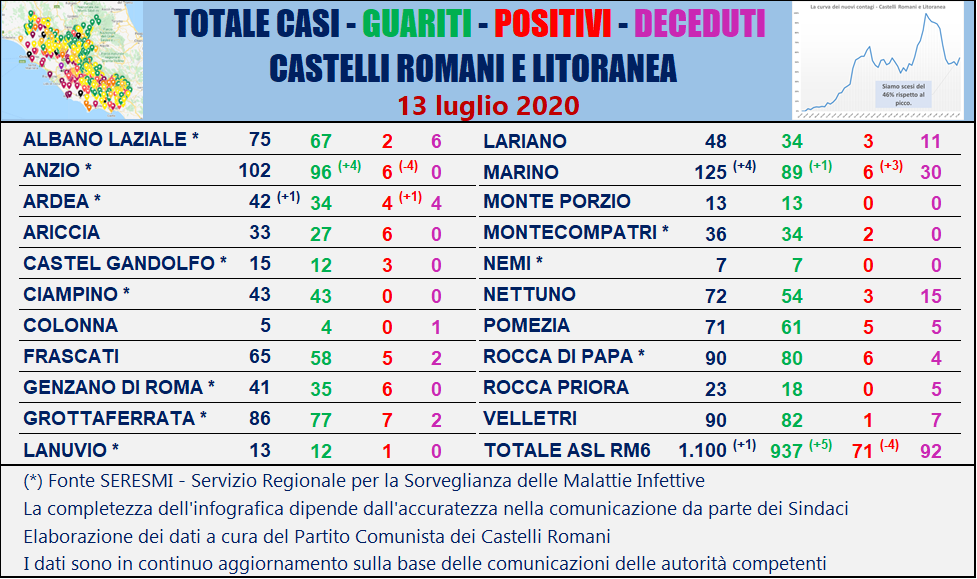 Il nuovo caso odierno (del 13 luglio ndr) si riferisce ad una badante filippina residente ad Ardea rientrata da poco in Italia. Inoltre, il Sindaco di Marino ha comunicato 4 nuovi casi (riferiti a due giorni fa) e una persona guarita. Il Sindaco di Anzio ha comunicato che 4 persone sono definitivamente guarite.