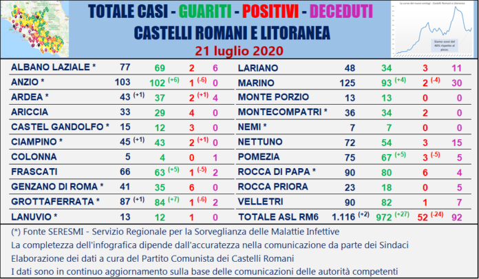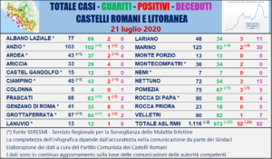 Nella tabella seguente viene riportata la ripartizione dei contagi per singolo comune dei Castelli Romani e della Litoranea sulla base delle comunicazioni ufficiali delle autorità competenti.