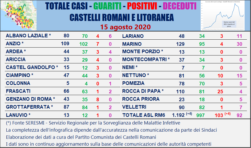 Nella tabella seguente viene riportata la ripartizione dei contagi per singolo comune dei Castelli Romani e della Litoranea sulla base delle comunicazioni ufficiali delle autorità competenti.