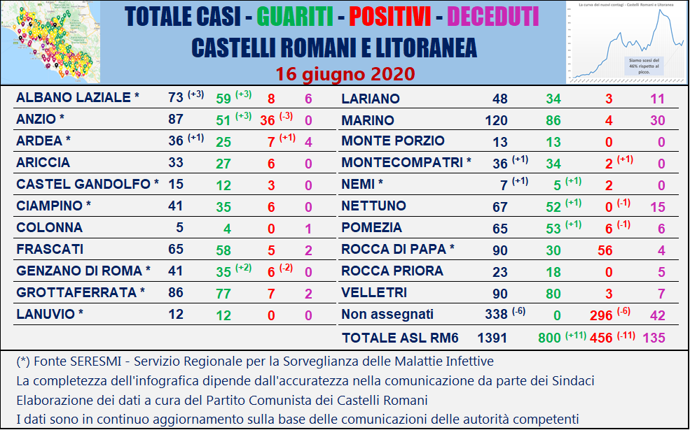 Martedì 16 Giugno sono guarite 11 persone ad Albano (+3), Anzio (+3), Genzano (+2), Nemi (+1), Nettuno (+1) e Pomezia (+1). È vergognoso che molti Sindaci dei Castelli Romani e litoranea sono occupati in crisi amministrative, rimpasti e risse continue, per cui non hanno un minuto di tempo per informare i cittadini sulla diffusione del coronavirus nel proprio comune. Gravissimo è il ritardo con cui la ASL RM6 comunica ai Sindaci le informazioni sulla diffusione del coronavirus nei Castelli Romani e Litoranea: ad oggi devono ancora essere comunicati 338 casi, di cui 42 decessi. Perché la ASL RM6 non comunica i dati a livello comunale, come le altre ASL della Regione Lazio? A causa di questo ritardo, per 11 comuni (Albano, Anzio, Ardea, Castel Gandolfo, Ciampino, Genzano, Grottaferrata, Lanuvio, Montecompatri, Nemi, Rocca di Papa) il numero dei casi pubblicati dal SERESMI (il Servizio Regionale per la Sorveglianza delle Malattie Infettive) è superiore al numero di casi comunicati dai Sindaci. Martedì 16 giugno il SERESMI ha aggiornato i suoi dati a livello comunale, segnalando altri 3 casi ad Albano e un altro caso rispettivamente ad Ardea, a Montecompatri e a Nemi.