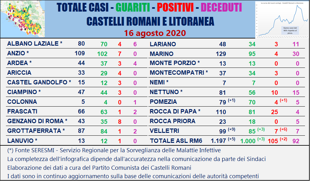 Nella tabella seguente viene riportata la ripartizione dei contagi per singolo comune dei Castelli Romani e della Litoranea sulla base delle comunicazioni ufficiali delle autorità competenti.