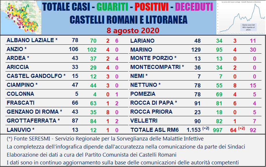 Nella tabella seguente viene riportata la ripartizione dei contagi per singolo comune dei Castelli Romani e della Litoranea sulla base delle comunicazioni ufficiali delle autorità competenti.