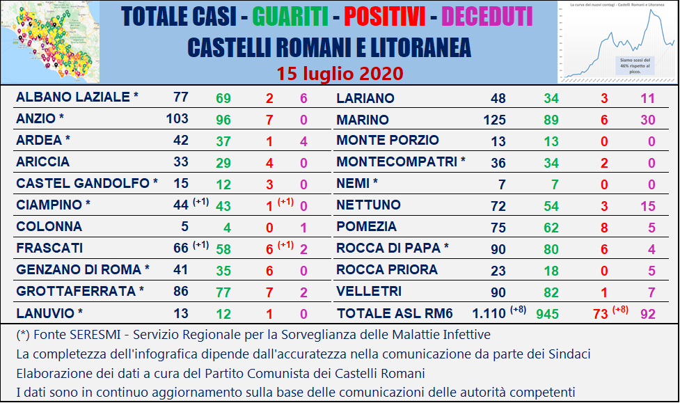 Nella tabella seguente viene riportata la ripartizione dei contagi per singolo comune dei Castelli Romani e della Litoranea sulla base delle comunicazioni ufficiali delle autorità competenti.
