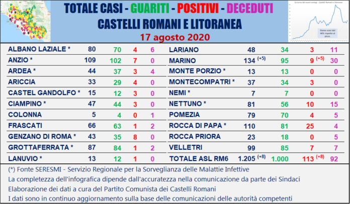 Nella tabella seguente viene riportata la ripartizione dei contagi per singolo comune dei Castelli Romani e della Litoranea sulla base delle comunicazioni ufficiali delle autorità competenti.