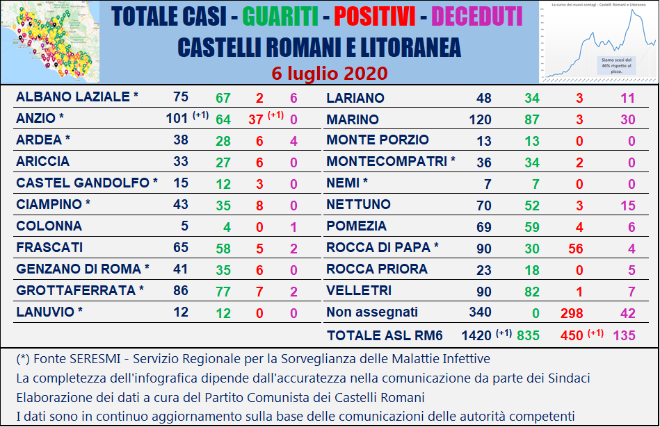 Nella ASL RM6, che comprende i Castelli Romani e la Litoranea, il 6 luglio si è registrato un nuovo caso al pronto soccorso del NOC, subito trasferito allo Spallanzani di Roma. L’uomo ha 37 anni e risiede ad Anzio. Il numero complessivo dei guariti è rimasto stabile a 835, il numero delle persone attualmente positive è salito a 450, mentre il numero dei decessi è rimasto stabile a 135 casi. Rispetto al picco la curva dei nuovi contagi è pericolosamente risalita al 96%.