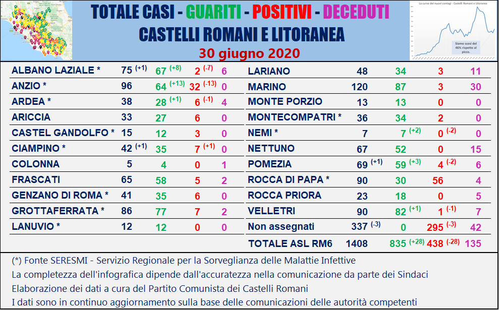 La maggior parte dei Sindaci dei Castelli Romani e litoranea hanno da settimane interrotto ogni comunicazione sulla diffusione del coronavirus. Le informazioni di aggiornamento che oggi, martedì 30 giugno, pubblichiamo sono desunte dai lavori del SERESMI. Aumentano i guariti (+28) ad Albano (+8), Anzio (+13), Ardea (+1), Nemi (2), Pomezia (+3), Velletri (+1). In particolare, a Nemi non ci sono più soggetti positivi al covid.