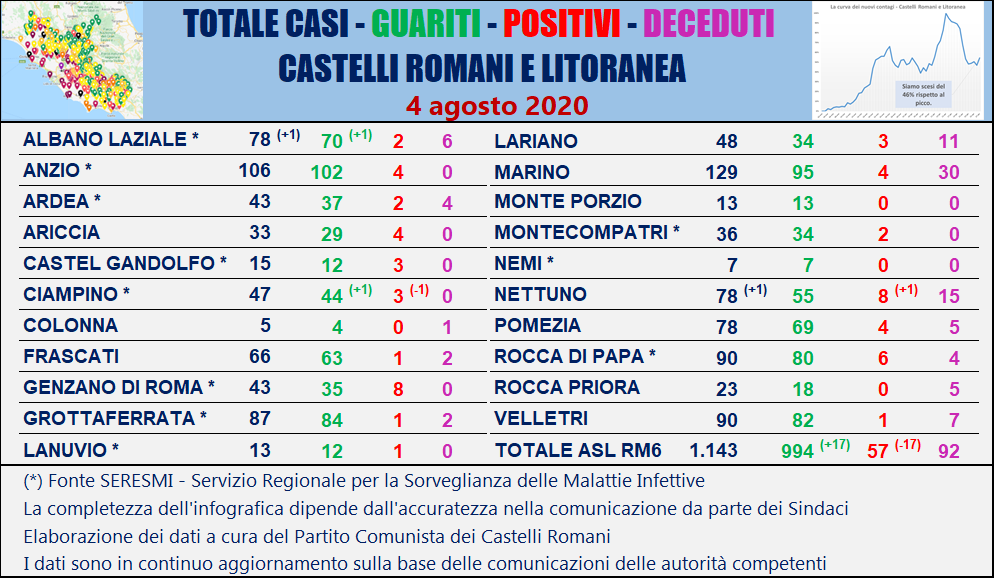 Nella tabella seguente viene riportata la ripartizione dei contagi per singolo comune dei Castelli Romani e della Litoranea sulla base delle comunicazioni ufficiali delle autorità competenti.