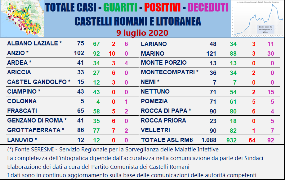 Nella ASL RM6, che comprende i Castelli Romani e la Litoranea, il 9 luglio non si è registrato nessun nuovo caso. Il numero complessivo dei guariti è rimasto stabile a 932, il numero delle persone attualmente positive è fermo a 64, mentre il numero dei decessi è rimasto stabile a 92 casi. Rispetto al picco la curva dei nuovi contagi è riscesa al 97%. Purtroppo non tutto è andato bene.