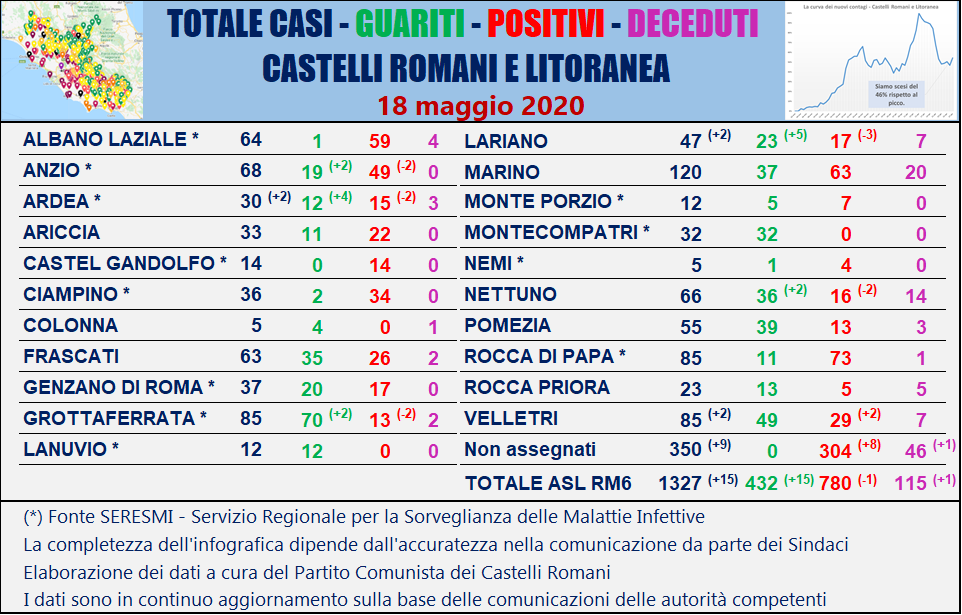 Tabella comuni dei comunisti sui positivi al Coronavirus Castelli Romani e Litoranea al 18 Maggio