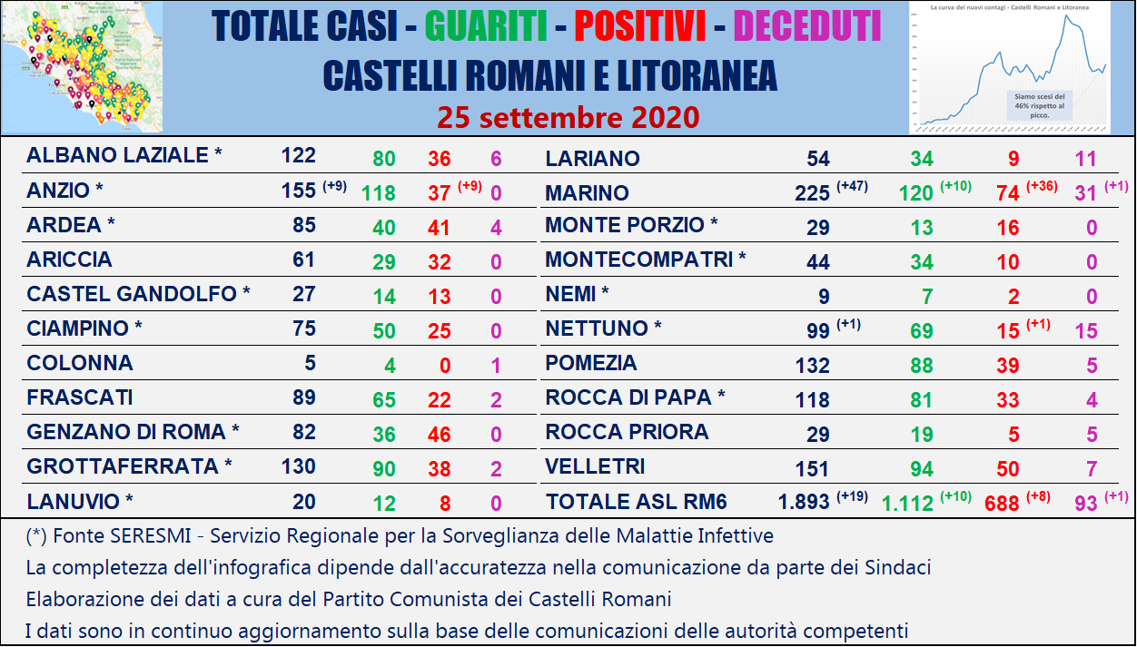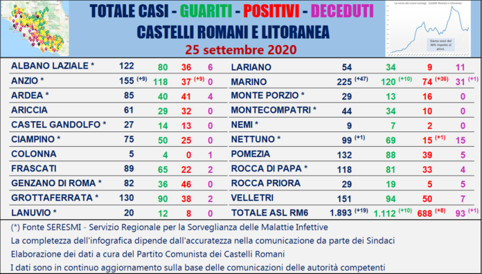 Nella tabella seguente viene riportata la ripartizione dei contagi per singolo comune dei Castelli Romani e della Litoranea sulla base delle comunicazioni ufficiali delle autorità competenti.