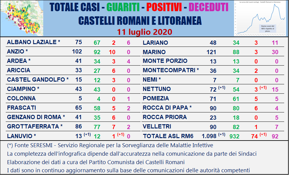 Nella tabella seguente viene riportata la ripartizione dei contagi per singolo comune dei Castelli Romani e della Litoranea sulla base delle comunicazioni ufficiali delle autorità competenti.