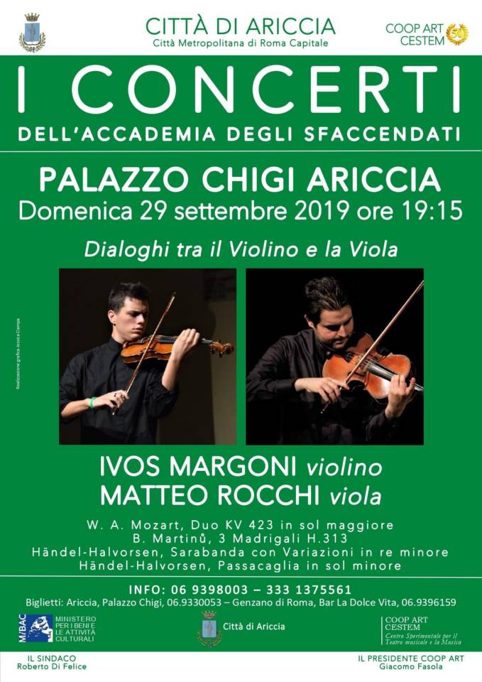 Domenica 29 settembre, alle ore 19.15,  nella Sala Maestra di Palazzo Chigi di Ariccia sarà di scena il talento di due giovani ed eccellenti musicisti : Ivos Margoni al violino e Matteo Rocchi alla viola. Dialoghi tra Violino e Viola è un percorso inusuale e intenso, un programma di musiche di grande virtuosismo in cui si alternano brani originali per i due strumenti e trascrizioni di capolavori di Händel che non mancheranno di entusiasmare il pubblico e suscitarne l’interesse. I Concerti dell’Accademia degli Sfaccendati continuano così la loro opera di scoperta e valorizzazione di nuovi talenti musicali italiani offrendo loro un palcoscenico di prestigio, sostenuti in questo dall’Amministrazione Comunale di Ariccia guidata dal Sindaco Roberto di Felice e dalla Direzione Generale dello Spettacolo dal Vivo del Ministero dei Beni e delle Attività Culturali.