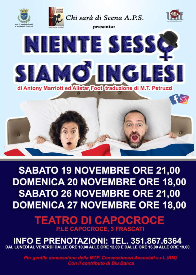Tommaso Mascherucci firma la regia di Niente Sesso, Siamo Inglesi. Scenografie di Maurizio Ciminelli. Assistenza tecnica di Alessandro Gaetani. Gli interpreti in ordine di apparizione sono: Elio Freda, Valentina Ferretti, Stefania Quagliani, Daniele Ponziani, Giampiero Cinelli, Beniamino Laurenzi, Igino Marchionne, Alessandra Costantini, Lucia Marchetti, Umberto Sorci, Maurizio Cafini, Alberto Sardini. Le repliche sono in programma per: domenica 20 novembre alle ore 18. Sabato 26 novembre alle ore 21 e domenica 27 novembre alle ore 18.
