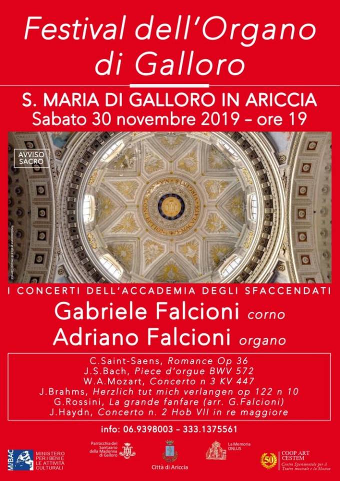 Ultimo appuntamento del Festival dell’Organo di Galloro sabato 30 novembre, alle ore 19, nella bella chiesa di Santa Maria di Galloro ad Ariccia. Protagonisti del concerto saranno due fratelli di grande talento, il cornista Gabriele Falcioni – molto apprezzato da Claudio Abbado e Riccardo Muti e corno solista al Teatro alla Scala di Milano sotto la guida di Daniel Barenboim – e l’organista Adriano Falcioni – concertista di caratura internazionale che ha inciso più di 30 CD – che proporranno un programma particolarmente interessante anche per l’incontro delle sonorità del corno e dell’organo. Da Bach a Saint-Saëns passando per Rossini e Brahms un percorso in un repertorio di grande fascino che ha le sue punte di diamante nei concerti per corno e orchestra, trascritti per corno e organo, di Mozart e Haydn. Una chiusura del Festival dell’Organo di Galloro che non poteva essere più intrigante. Il Concerto è a ingresso libero. “I Concerti dell’Accademia degli Sfaccendati” sono realizzati dalla COOP ART con il patrocinio e il contributo del Comune di Ariccia e del Ministero per i Beni e le Attività Culturali (MiBAC).