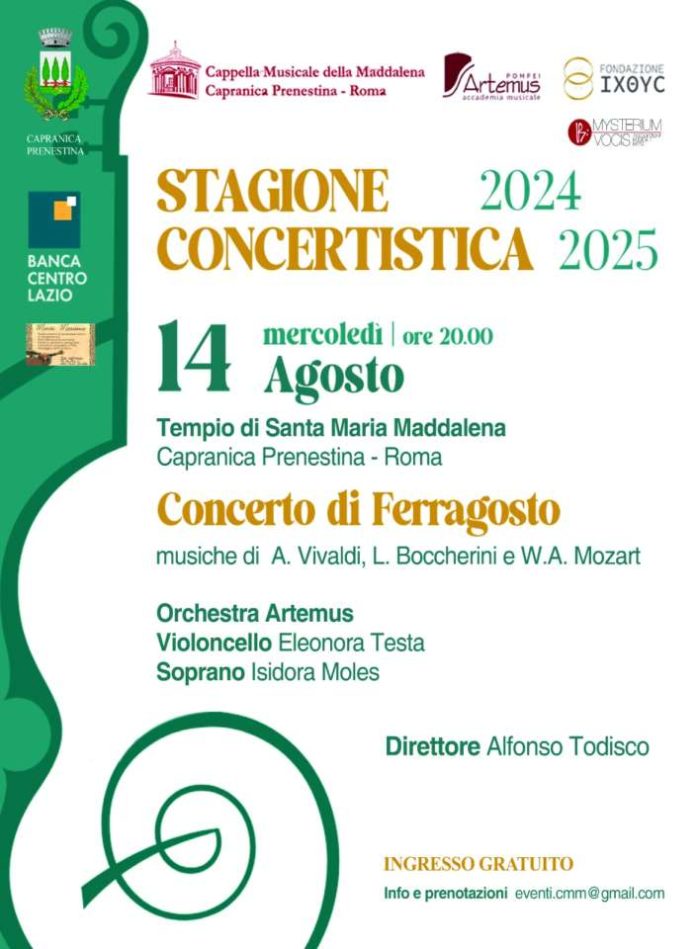 Presso il Tempio di Santa Maria Maddalena a Capranica Prenestina (Roma), si terrà il 14 Agosto alle ore 20 il tradizionale Concerto di Ferragosto. L’iniziativa porta la firma di Don Davide Martinelli, divenuto ormai un punto di riferimento non soltanto spirituale, ma culturale e sociale della Comunità Capranichese. Sarà ancora una volta Alfonso Todisco a Dirigere L’Orchestra Artemus per le musiche di A.Vivaldi, L.Boccherini e W.A.Mozart. Eleonora Testa sarà al Violoncello e Isidora Males -Soprano affiancheranno il Maestro.