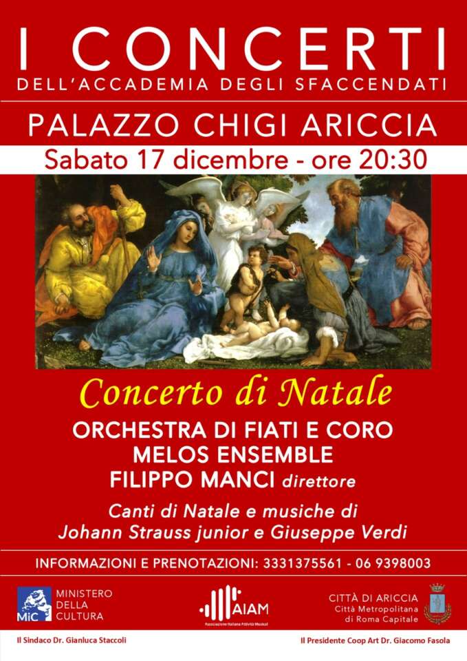 Sabato 17 dicembre, alle ore 20.30, “I Concerti dell’Accademia degli Sfaccendati” programmano un Concerto di Natale che vedrà impegnati coro e orchestra per festeggiare, oltre alle festività natalizie e di fine anno, anche la chiusura della propria Stagione 2022 al Palazzo Chigi di Ariccia. L’Orchestra di Fiati e il Coro dell’Associazione Melos Ensemble, diretti da Filippo Manci, proporranno nella Sala Maestra un bel programma che unisce musiche viennesi, da concerto di capodanno, di Johann Strauss junior – Sul bel Danubio blu, l’Ouverture del “Pipistrello” e Tritsch-tratsch polka – a tradizionali Canti di Natale rivisitati dalla fantasia del direttore Filippo Manci con un omaggio al Verdi risorgimentale di “Va, pensiero”. Una chiusura scoppiettante della programmazione 2022 che si preannuncia di grande fascinazione e qualità musicale. I Concerti dell’Accademia degli Sfaccendati al Palazzo Chigi di Ariccia sono realizzati dalla COOP ART di Roma con il contributo del Ministero della Cultura, della Regione Lazio e del Comune di AricciaInfo e prenotazioni: 3331375561 – 069398003