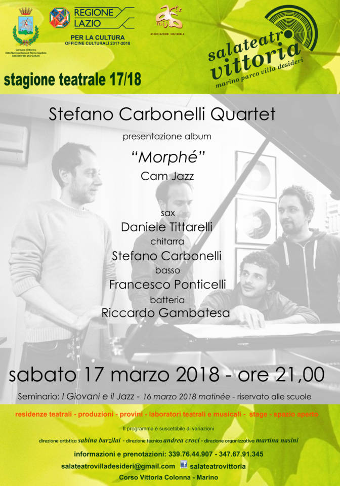 Sabato 17 marzo 2018 alle ore 21,00 sarà la volta di STEFANO CARBONELLI e il suo Jazz QUARTET che presenterà il suo nuovo Album MORPHE’ della casa discografica CAM JAZZ.