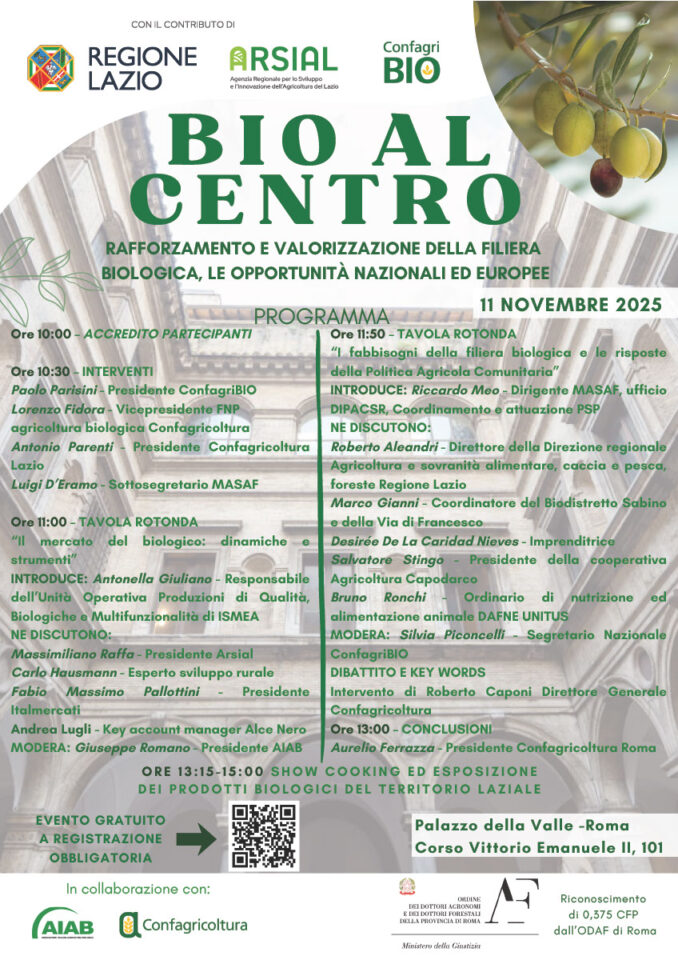 ConfagriBIO, l’associazione di Confagricoltura dedicata al biologico, in collaborazione con AIAB e la Regione Lazio tramite ARSIAL, organizza “BIO AL CENTRO – I prodotti biologici della campagna laziale dritti al cuore di Roma”. L’iniziativa è finalizzata a promuovere e valorizzare le eccellenze del biologico laziale, ed è strutturata in due eventi distinti che si terranno nelle giornate dell’11 e del 14 novembre prossimi. Gli appuntamenti sono pensati per offrire una visione completa del settore, dall’aspetto istituzionale a quello più esperienziale e pratico sul campo.