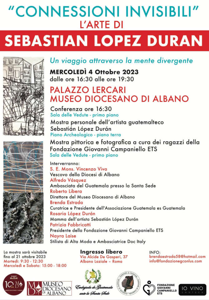 Mercoledì 4 Ottobre 2023 il Museo Diocesano di Albano ha il piacere di ospitare presso il Piano Archeologico di Palazzo Lercari la mostra personale “Connessioni Invisibili: un viaggio attraverso la mente divergente” dell’artista guatemalteco Sebastián López Durán.