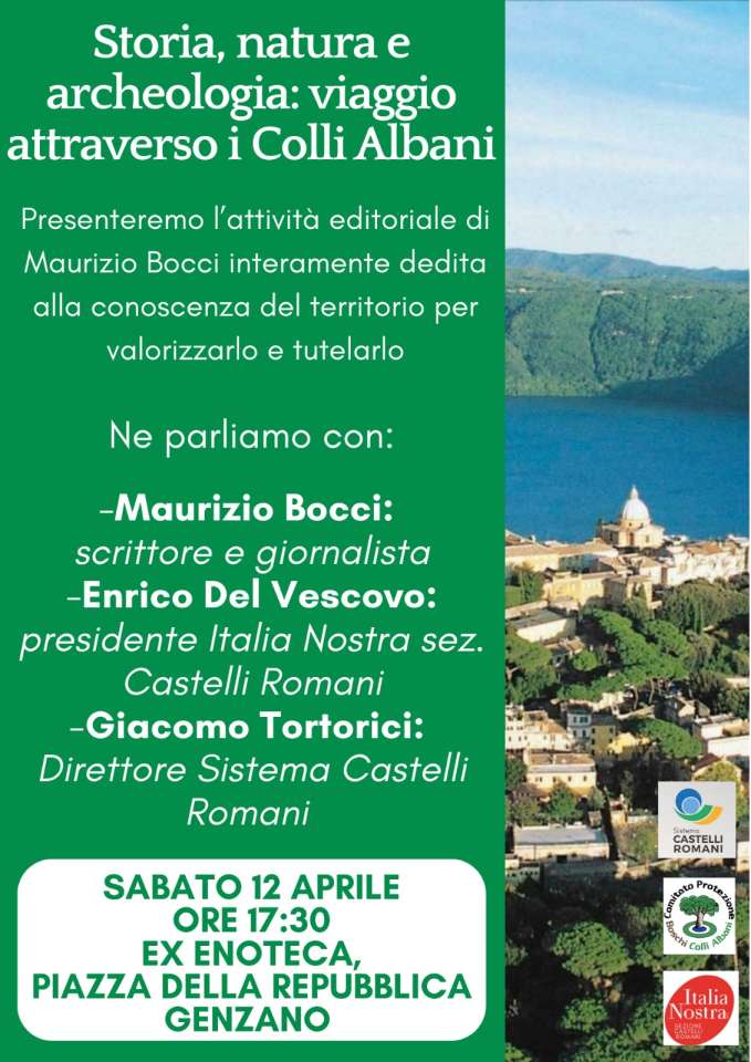 Italia Nostra Castelli Romani, insieme al Comitato Protezione Boschi Colli Albani, vi invita calorosamente a partecipare a questo evento, in occasione della presentazione del libro di Maurizio Bocci “Sulle tracce del tempo”, con l’intervento anche di Giacomo Tortorici. Sarà un’occasione per uno scambio libero di cultura, idee, informazioni ed opinioni sullo stato del nostro territorio, il suo patrimonio, la sua conservazione e le minacce che su di esso purtroppo incombono”. Lo rendono noto gli organizzatori