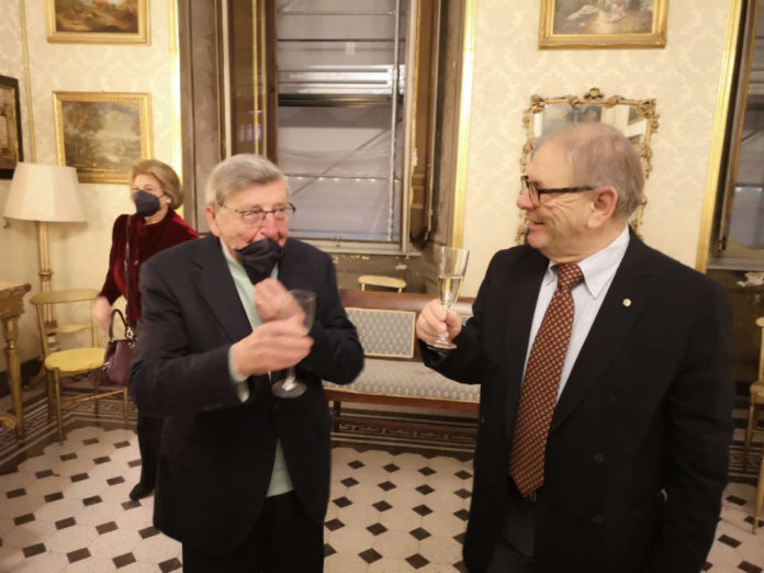 Nel corso di un evento privato, che si è svolto venerdì 7 gennaio scorso a Palazzo Ferrajoli di Roma e che ha visto ancora una volta protagonista il Vino Frascati, il Presidente Felice Gasperini ha incontrato l’On.le Vincenzo Scotti, che per 11 volte è stato Ministro e Viceministro. La presenza nella prestigiosa sede di Palazzo Ferrajoli ha permesso di incontrare inoltre rappresentanti del mondo delle arti, della stampa e del commercio capitolino, tra cui Angelo Di Porto, Vice Presidente della Federazione Italiana Esercenti Pubblici e Turistici, nonché Presidente dell’Associazione Portico D’Ottavia.