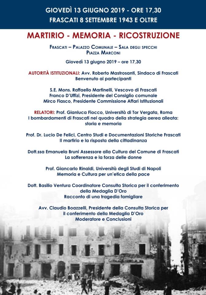 Giovedì 13 giugno alle ore 17,30 nella Sala degli Specchi del Comune di Frascati si terrà il convegno dal titolo Martirio – Memoria – Ricostruzione, nel corso del quale saranno presentati alla cittadinanza i risultati raggiunti dalla Consulta Storica per la Medaglia d’Oro al Valore civile. L’Amministrazione comunale ha infatti intenzione di chiedere la revisione dell’istanza e ottenere la Medaglia d’oro al valore civile per le vittime e i gravi danni inferti alla Città dai bombardamenti del Settembre del 1943. Saranno presenti e apriranno i lavori del convegno il Sindaco di Frascati Roberto Mastrosanti, il Vescovo della Diocesi di Frascati, S.E. Mons. Raffaello Martinelli, il Presidente del Consiglio comunale Franco D’Uffizi e il Presidente della Commissione Affari Istituzionali Mirko Fiasco. Sono stati inoltre invitati come relatori il Prof. Gianluca Fiocco dell’Università di Tor Vergata di Roma, che parlerà de: I bombardamenti di Frascati nel quadro della strategia aerea alleata: storia e memoria. Il Prof. Dr. Lucio De Felici del Centro Studi e Documentazioni Storiche Frascati su: Il martirio e la risposta della cittadinanza. La Dott.ssa Emanuela Bruni, Assessore alla Cultura del Comune di Frascati, su: La sofferenza e la forza delle donne. Il Prof. Giancarlo Rinaldi dell’Università degli Studi di Napoli su Memoria e Cultura per un’etica della pace. Il Dott. Basilio Ventura, Coordinatore Consulta Storica per il conferimento della Medaglia D’Oro, su: Racconto di una tragedia familiare. L’Avv. Claudio Boazzelli, Presidente della Consulta Storica per il conferimento della Medaglia D’Oro è il moderatore del convegno e chiuderà gli interventi presentando le conclusioni.