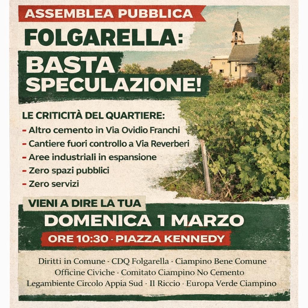 “Le cittadine e i cittadini di Ciampino sono invitati a un’assemblea pubblica per il futuro del quartiere Folgarella, domenica 1° marzo alle 10:30, nel giardino di fronte a Piazza Kennedy (ingresso pedonale Scuola Paola Sarro).