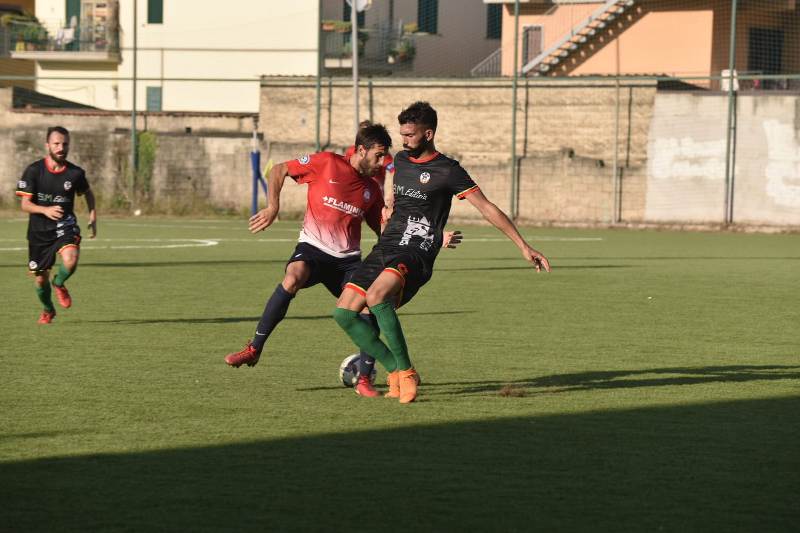La prima grande occasione capita sulla testa di Sabelli su cross di Crescenzo al quinto minuto di gioco; reattivo l’estremo difensore Vitali. Poi al 18’ bellissima incursione di Origlia, cross al centro radente l’erba, Basilico in scivolata non riesce ad agganciare la palla. Al 22’ occasione per il giovane Origlia, tiro al volo; ancora una volta reattivo il portiere della Flaminia. Nel mezzo bravo anche l’estremo difensore Andrea Florio, che con un tufo sulla sua sinistra manda in angolo il tiro dell’attaccante in maglia rossa. Flaminia che si rende ancora pericolosa al 29’: l’ala sinistra crossa al centro, il centroavanti calcia a colpo sicuro, decisiva la deviazione in angolo di Tarantino, con palla che sfiora il palo alla destra di Florio. Al 34’ Basilico sbatte su Vitali; l’estremo difensore castellano blocca in uscita bassa Origlia lanciato a rete. Allo scadere della prima frazione di gioco, Morbidelli colpisce la traversa con un calcio di punizione dal limite.
