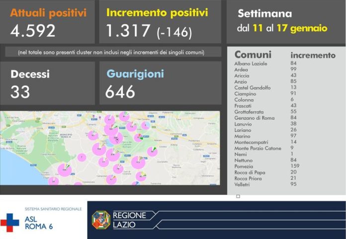 “Coronavirus, Asl Roma 6 – sono 83 i casi nelle ultime 24h e si tratta di casi isolati a domicilio o con link familiare o contatto di un caso già noto. Si registra un decesso di 80 anni con patologie”. Lo rendono noto Salute Lazio e Regione Lazio lunedì 18 Gennaio.