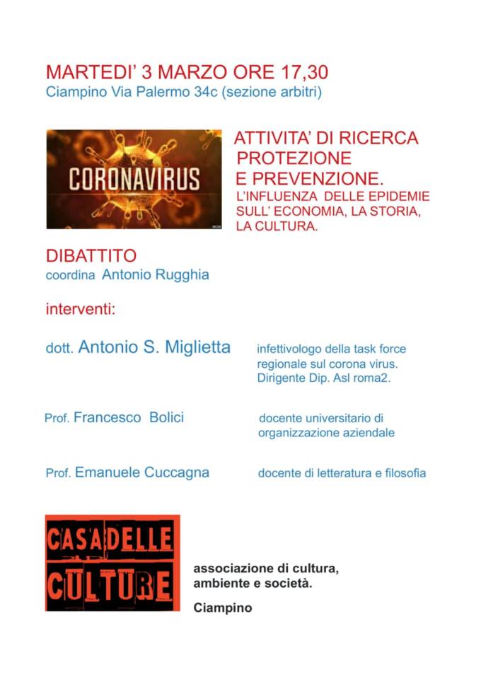 Alla Case delle Culture di Ciampino martedì 3 marzo incontro tra un rappresentante della comunità scientifica e i cittadini sul Coronavirus