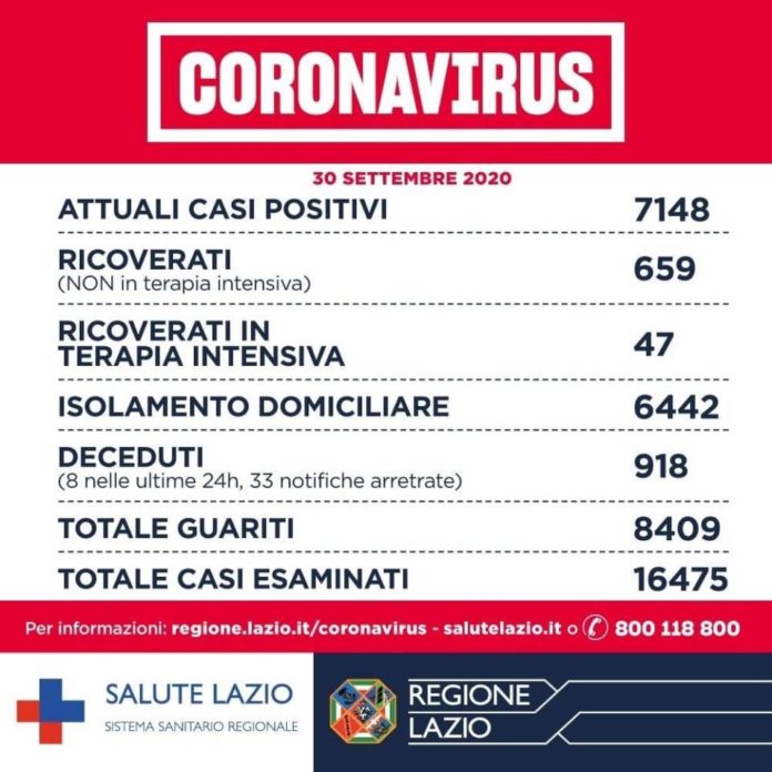 Coronavirus, bollettino della Regione Lazio del 30 Settembre