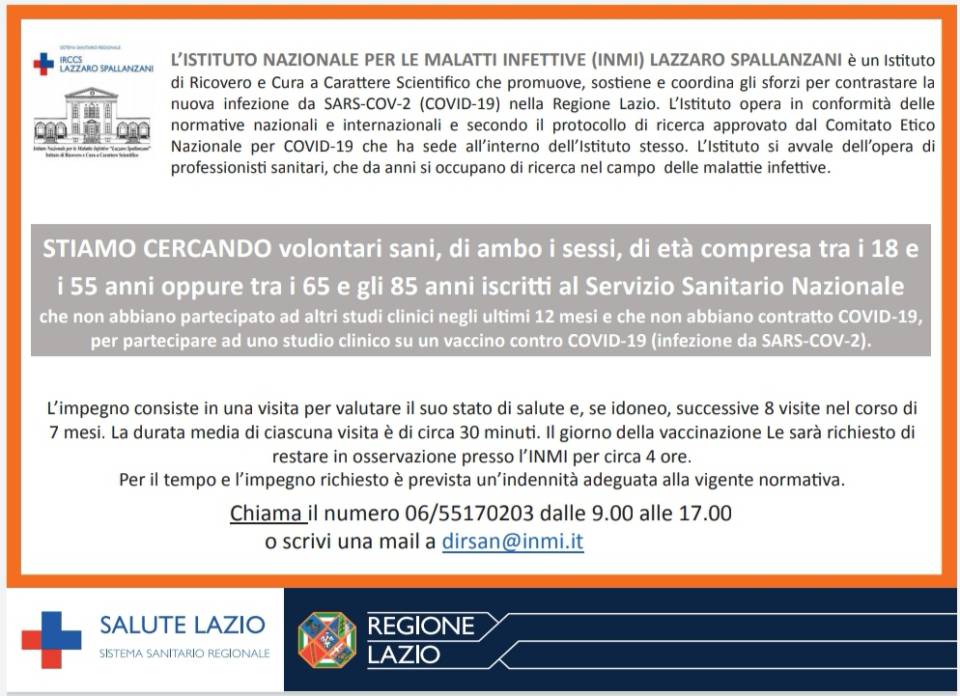 VACCINO SPALLANZANI: SONO ARRIVATE LE PRIME DOSI DEL VACCINO MADE IN ITALY, PRONTI ALLA SPERIMENTAZIONE SU UOMO DAL 24 AGOSTO, SPALLANZANI E’ ALLA RICERCA DEI VOLONTARI PER LA SPERIMENTAZIONE’