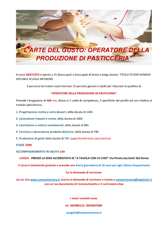 Il corso si tiene presso la sede “A tavola con lo chef” sita in via Pineta Sacchetti 263 a Roma.