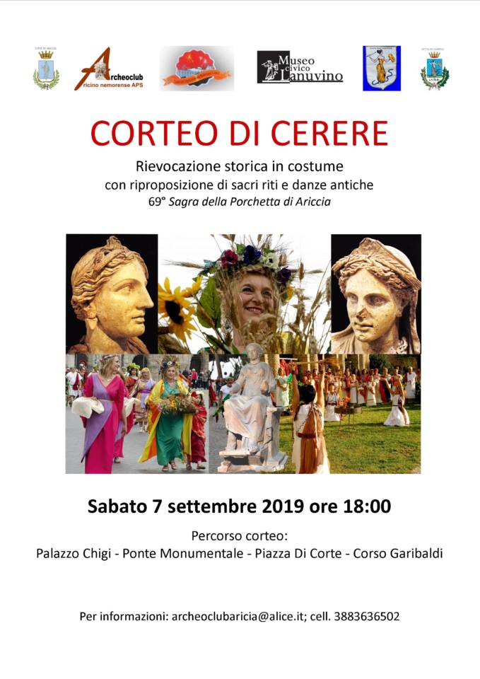 In occasione della 69° Sagra della Porchetta di Ariccia IGP non mancheranno gli appuntamenti con la cultura e Sabato 7 settembre, alle ore 18.00, andrà in scena la rievocazione storica in costume del Corteo di Cerere manifestazione ideata da Archeoclub Aricino Nemorense, presieduto da Maria Cristina Vincenti, che quest’anno vedrà la partecipazione del Gruppo Storico Lanuvium, diretto da Massimo Fiorini, con oltre cinquanta figuranti. L’evento, inserito nelle manifestazioni della Sagra 2019 sarà reso possibile grazie alla collaborazione con il Comitato Festeggiamenti, il Comune di Ariccia, il Palazzo Chigi, il Museo Civico Lanuvino, il Comune di Lanuvio e i produttori di porchetta IGP e di pane del territorio. Il corteo, come di consueto, uscirà dal portale della splendida dimora barocca di Palazzo Chigi e quest’anno in via del tutto eccezionale sfilerà sul Ponte Monumentale, per proseguire sulla Piazza di Corte e transitare lungo il corso Garibaldi. I rievocatori in costume impersoneranno i devoti alla dea Cerere e ricostruiranno la processione votiva in onore della dea del grano con offerte di pane e focacce, tra cui la maza sacra a Giunone Sospita, cereali (farro, orzo, ceci, ecc.), frutta, vino e maialini votivi. Apriranno il Corteo la dea Cerere e Persefone (fanciulla offerente). Al centro del corteo l’immancabile maialino votivo o porchetta. La manifestazione si concluderà sulla Piazza di Corte con la riproposizione di antichi culti e danze a cura di Luana Calvani, direttore artistico del Gruppo Storico Lanuvium. Durante il corteo la narrazione sarà affidata ad un gruppo di archeologi quali Alberto Silvestri, Luca Attenni e Maria Cristina Vincenti che spiegheranno al pubblico il significato della manifestazione. Un cibo ‘divino’ dunque la porchetta, destinato sin dall’antichità agli dei ed oggi eccellenza culinaria del Lazio. Ma la porchetta di Ariccia, in età romana Aricia patria della madre dell’Imperatore Augusto, non solo è la più famosa (ha ottenuto nel 2011 il riconoscimento IGP) ma è anche molto antica e ce lo dice l’archeologia. Nel 1927 proprio nel lato ovest della Valle di Ariccia vennero alle luce una serie di statue in terracotta (risalenti al III sec. a.C.), tra cui alcune offerenti in trono con un maialino tra le mani, ora esposte al Museo Nazionale Romano, che rivelarono il culto di Cerere nella città latina. L’offerente con maialino pone oggi anche l’accento sulla denominazione stessa del noto prodotto gastronomico: il termine “porchetta” (ovvero “piccolo maiale di genere femminile”) si conserva sin dall’antichità, in palese contraddizione con l’animale adulto usato per la sua lavorazione.