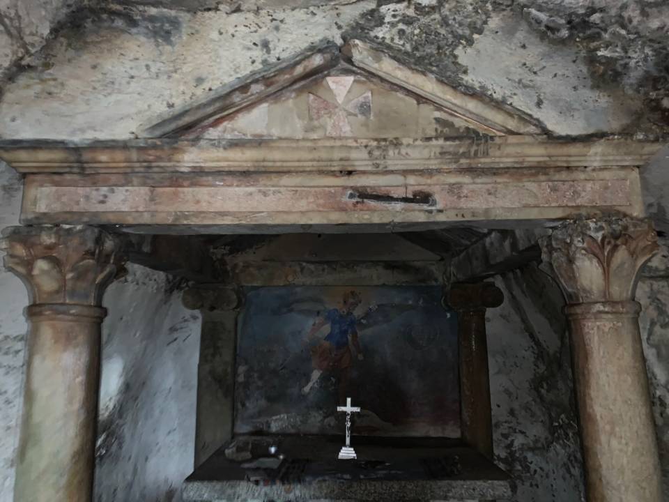 Al centro è posto un altare ricavato con l’utilizzo di antico materiale romano e la prima datazione risale verso il 1250 d.C., comunque non si può escludere affatto che sia stato un luogo di culto pagano, quindi molto più antico. All’interno si trovano affreschi del 1480 che rappresentano alcune scene devozionali con santi.