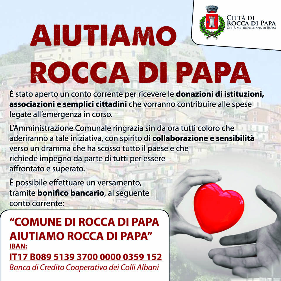 “COMUNE DI ROCCA DI PAPA – AIUTIAMO ROCCA DI PAPA” – IBAN IT17 B089 5139 3700 0000 0359 152 -Banca di Credito Cooperativo dei Colli Albani. “Dichiara l’Amministrazione Comunale di Rocca di Papa.