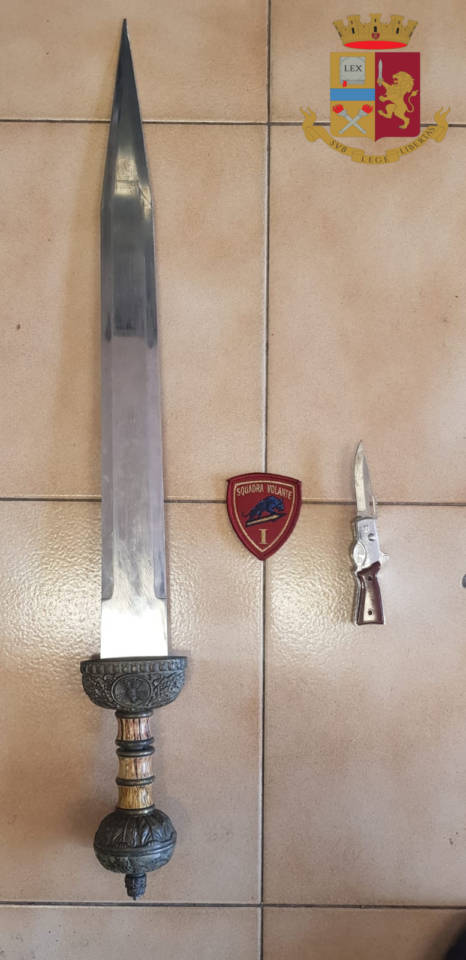 La spada in acciaio appuntita del tipo “Gladio”, della lunghezza totale di 75 cm, di cui 57 di lama, veniva sequestrata, in quanto oggetto del reato.