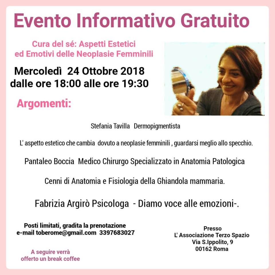 La malattia oncologica affrontata oltre i suoi aspetti clinici, ma nella sfera personale del se delle pazienti. E’ questo il tema del convegno gratuito che si terrà il prossimo Mercoledì 24 Ottobre a Roma, dalle ore 18;00 alle 19:30 presso la sede dell’Associazione Terzo Spazio, sita in Via S. Ippolito 9, dal titolo: “Cura del se: aspetti estetici ed emotivi delle neoplasie femminili”. I relatori che interverranno sono: la dermopigmentista specializzata Stefania Tavilla, Il Dott. Pantaleo Boccia Medico Chirurgo Specializzato in Anatomia Patologica e la Psicologa Fabrizia Argirò.