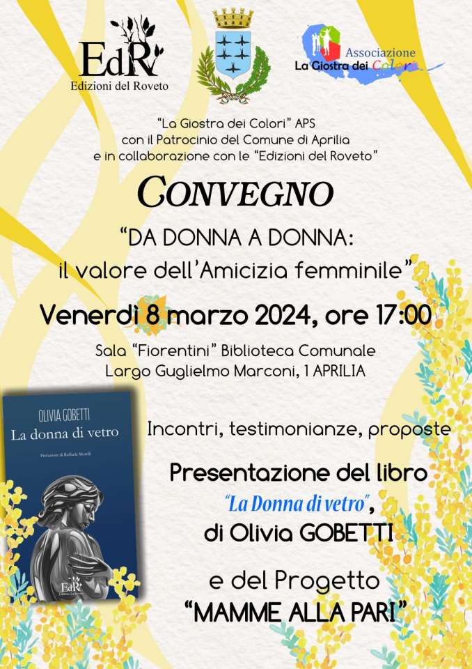 Venerdì 8 marzo, alle ore 17:00, presso la Sala “Fiorentini” della Biblioteca comunale di Aprilia, in Largo G. Marconi 1, si svolgerà un Convegno sul tema della solidarietà femminile, organizzato dall’Associazione di Promozione Sociale “La Giostra dei Colori”, in collaborazione con le “Edizioni del Roveto” e con il Patrocinio del Comune di Aprilia. L’evento coincide con la Giornata internazionale della donna e si pone l’obiettivo di fare cultura, in termini propositivi, su un tema sociale di grande rilevanza qual è quello dell’Amicizia tra donne.