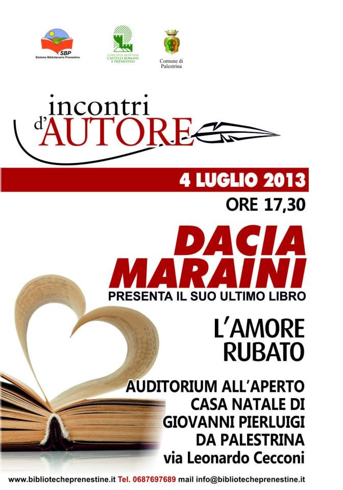 Prosegue l’attività di promozione culturale del Sistema Bibliotecario Prenestino con un appuntamento d’eccezione nell’ambito dell’iniziativa “Incontri d’Autore”. Giovedì 4 luglio alle ore 17.30 presso l’Auditorium all’aperto della Casa Natale di Giovanni Pierluigi da Palestrina, la scrittrice Dacia Maraini presenterà il suo ultimo libro “L’AMORE RUBATO”.