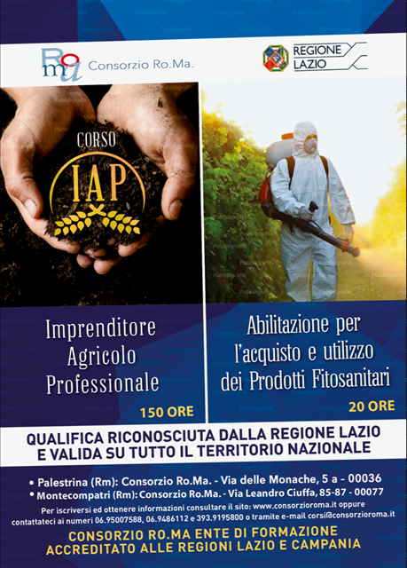 Parte il 10 maggio la 12a edizione del corso IAP – Imprenditore Agricolo Professionale. Le iscrizioni sono ancora aperte, gli esami saranno effettuati entro luglio 2019. Il corso di 150 ore si terrà nei giorni di venerdì dalle ore 14 alle ore 20 e sabato dalle ore 9 alle ore 17. Il costo è fissato in Euro 520 e sono rateizzabili. Questa qualifica darà punteggio per accedere ai finanziamenti a fondo perduto previsti dal PSR (programma di sviluppo rurale) ed agevolazioni fiscali e contributive. Possibile seguire presso il Consorzio Ro.Ma. anche corsi per il rilascio del certificato di abilitazione all’acquisto e all’utilizzo dei prodotti fitosanitari. Per il primo rilascio la durata del corso è fissata in 20 ore al costo di 130 Euro, rinnovo consta di un corso di 12 ore per un costo di 70 Euro. Per info chiamare i numeri 0695007588 e 069486112.