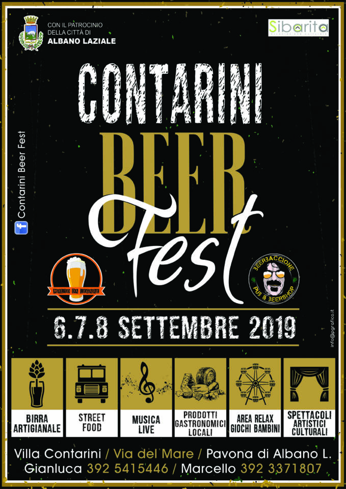 Immersi nel verde del parco comunale di Villa Contarini, “Malto da Legare Beershop” in collaborazione con “Beerbaccione Pub” mandano in scena un festival incentrato sulla birra artigianale nazionale ed internazionale, sullo streetfood di qualità, sull’enogastronomia con prodotti caseari e salumi artigianali, vini naturali, musica live. Godendo di un’area per il baby parking i più piccini potranno usufruire dei giochi pubblici intrattenuti da spettacoli ed animazioni. Presenti, inoltre, stand artistici di art deco e body painting. L’associazione UDB, Unione Degustatori Birra, sosterrà la divulgazione e la cultura della birra artigianale con la sua presenza. Il Sindaco Nicola Marini e l’Assessore alle Politiche Giovanili di Albano Laziale, Alessandra Zeppieri, hanno così commentato l’iniziativa: «È stato un piacere per noi accogliere e patrocinare Contarini Beer Fest, evento rivolto a tutta la cittadinanza ed in particolar modo alla popolazione giovanile. Sarà un’occasione di aggregazione e di svago; una bella iniziativa che si aggiunge alle altre iniziative organizzate in questi anni per costruire e rinsaldare legami all’interno della nostra comunità cittadina. Ringraziamo Gianluca Curiazio, Angelo Marcello Pau e l’Associazione Culturale e Sportiva Sibarita per l’impegno e la passione messi nell’organizzazione di questa prima edizione. Un ringraziamento all’Ufficio Politiche Giovanili e a tutti gli uffici comunali per il contributo dato». Orari: venerdì e sabato dalle ore 18.00 in poi, domenica dalle ore 15.00 in poi. Programma, informazioni e contatti: www.facebook.com/contarinibeerfest