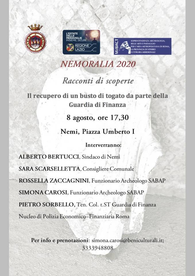 Il 8-9-12-13 2020 a Nemi si svolgerà la quinta edizione di “Nemoralia – Le Idi di Diana”, rievocazione dell’antica festa dedicata alla Dea Diana Nemorensis. Si trattava di una delle festività religiose e civili più importanti dell’epoca preromana e romana. Veniva celebrata il 13 di agosto presso il santuario Nemi, luogo di culto e riunione delle genti latine. In onore della Dea processioni di donne si snodavano lungo la via sacra fino ad arrivare al Tempio, con il capo adornato di corone di fiori, munite di torce accese. Attraverso questa ricostruzione storica il progetto vuole promuovere e diffondere la cultura del territorio e creare un punto di riferimento per studiosi, ricercatori e appassionati. La manifestazione prevede la realizzazione di vari eventi: mostre, seminari, conferenze, passeggiate e spettacoli che si svolgeranno a Nemi, nel Palazzo Ruspoli, al Centro Ittico Catarci, al santuario di Diana e la rievocazione dell’originaria sfilata di donne in costume che partirà dal centro storico del paese. Il progetto è ideato e realizzato dalla dott.ssa Sara Scarselletta e dal Comune di Nemi in collaborazione con la Soprintendenza Archeologia, Belle Arti e Paesaggio per l’area metropolitana di Roma, la Provincia di Viterbo e l’Etruria Meridionale, la Regione Lazio, la Guardia di Finanza, il Museo delle “Religioni Raffaele Pettazzoni”, l’Associazione Culturale Calliope, l’Associazione Cuturale “Il Flauto Magico”, il gruppo folkloristico Terra Nemorense, l’Associazione Culturale Crasform, l’Associazione Culturale Tempesta, il G.A.A.L.N.A. , l’Università di Monaco ed il Centro Ittico Catarci. La manifestazione si aprirà l’8 agosto alle 17,00 con la presentazione dei progetti di valorizzazione dell’area archeologica del Santuario di Diana e del recupero del busto di togato proveniente da Nemi in piazza Umberto I a cura della Soprintendenza Archeologia, Belle Arti e Paesaggio per l’area metropolitana di Roma, la Provincia di Viterbo e l’Etruria Meridionale , del Gruppo Tutela Patrimonio Archeologico della Guardia di Finanza e del Comune di Nemi e proseguirà nelle giornate successive con un programma ricco di eventi: visite guidate, al borgo ed al Museo delle Navi e laboratori di archeologia per bambini a cura del G.A.A.L.N.A; lo spettacolo itinerante dal titolo La valle del lago tra riti, storia e tradizioni con Terra Nemorense e I passi della tradizione, a cura dell’associazione culturale Il Flauto Magico; la visita al Santuario di Diana Nemorense organizzata dalla Soprintendenza in collaborazione con l’Università di Perugia, per chiudere il 13 agosto alle 17,00 con il seminario dal titolo Le Donne di Artemide e Diana. IV Seminario “Artemide e Diana. Divinità a Confronto” a cura del Museo delle Religioni e dell’Associazione Calliope presso il Centro Ittico Catarci e la sera alle 21,00 presso l’androne di Palazzo Ruspoli, in Piazza Umberto I, l’evento rievocativo dal titolo I Licia di Diana. Breve evento rievocativo dell’offerta del licium alla dea a cura dell’Associazione Culturale Tempesta. Tutti gli eventi verranno svolti in base alla normativa emergenziale vigente, pertanto per la partecipazione si richiedono la prenotazione e l’uso della mascherina. Per info visitare la pagina facebookNemoralia o contattare il numero 3333948808″. Lo comunica il Comune di Nemi.
