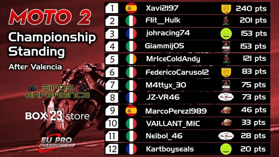 Campione delle 4 ruote scoperte e coperte, il Sim Racer d’eccellenza Daniele Zumbo (F1it_hulk) dimostra notevoli capacità anche nel mondo delle due ruote con un’incredibile stagione in sella ai bolidi della categoria Moto2. Una stagione caratterizzata da alti e bassi che gli permettono però di concludere il campionato con un’impeccabile secondo posto, in seguito ad una lotta a tre per il mondiale con antagonisti Johracing74 e Xavi2197. Non parte favorito per il titolo, ma Daniele Zumbo dimostra tutto il suo talento tenendo la testa della classifica per ben 3 round consecutivi. Da qui iniziano le difficoltà. Notevoli crash causano la perdita della leadership e così F1it_hulk è costretto ad inseguire. Ne approfitta Xavi2197 che, vincendo 4 gare consecutive, mette in cassaforte il mondiale, potendo così affrontare il finale con più tranquillità. Da qui in poi assistiamo ad un’avvincente lotta per la seconda piazza del mondiale tra F1it_hulk e Johracing74. Arma fatale per Johracing74 fu la costanza delle prestazioni del suo rivale che, conquistando 2 vittorie, riuscì ad allungare in campionato. Qui termina la stagione e si assegnano i premi. Gradino più alto per Xavi2197 con una prestazione onorevole, seguito da F1it_hulk che archivia il secondo trofeo del championship. Terzo premio per Johracing74. A seguire tutti i restanti protagonisti che hanno dato vita e creato emozioni a tutti gli appassionati dell’e-sport a due ruote: P4 per Giammij05, seguito da MrIceColdAndy e FedericoCaruso12. Settima posizione per M4ttyx_30 tallontato da JZ-VR46, distante soli due punti. Nona piazza per MarcoPerez1989 che conclude avanti a VAILLANT_MIC. Chiusa la top ten rimangono due soli sim racer: Neibol_46 in undicesima posizione e Kartboyseals che chiude in dodicesima e ultima posizione.