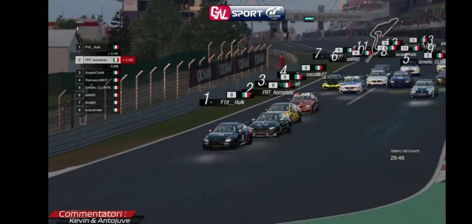 Partito ufficialmente il GT CHAMPIONSHIP con la prima tappa al Nurburbring GP, tanto spettacolo con strategie, sorpassi, controsorpassi e rimonte. Succede praticamente tutto nei primi 10 minuti di gara dove assistiamo ad un’uscita di pista di Vincent Tummarello(R7-vin), probabilmente tamponato in curva 1 da qualcuno nelle retrovie; Danno spettacolo anche Alfonso Biroccino(SS6li85), Francesco Marino(FrancescoMr27), Alessio Tricolore(Alexgamer951) e Andrea Simi(Simello_CLUBITA) che sempre nei primi 10 minuti si scambiano posizioni su posizioni a ritmo di sorpassi e sportellate, dove alla fine ha la meglio Andrea Simi pedinato da Alfonso Biroccino. Nelle retrovie troviamo una super gara di Gabriele Vitariello(gabryvita28) che avanza di 4 posizioni rispetto a quella di partenza. Peccato per i due Rookies Luca Varriale(lucavarriale) e Antonio Perillo(Tony_Perillo) che sono costretti al ritiro per colpa di un crash e del solito bug in corsia dei box.