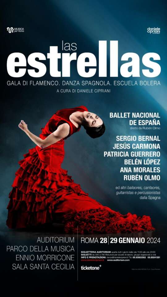 Manca poco al 28 e 29 gennaio 2024, date in cui, alle ore 21,00, debutterà all’Auditorium Parco della Musica, Sala Santa Cecilia – Roma, nel quadro della Stagione della Fondazione Musica per Roma, Las Estrellas. Il gala, con la direzione artistica di Daniele Cipriani, vede protagonisti il Ballet Nacional de España, grande compagnia e ambasciatrice della danza spagnola nel mondo, e i maggiori bailarines ( “ballerini”) e bailaores (“danzatori di flamenco”) del momento.