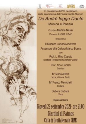 Giovedì 23 settembre 2021 alle 21,00 presso i Giardini di Patmos a Grottaferrata (ingresso via Garibaldi con green pass e mascherina obbligatori), l’associazione culturale La Terzina, in partenariato con la Città di Grottaferrata, presentano De André legge Dante. Musica e poesia, serata evento nel corso della quale la poesia del Sommo Poeta si mescolerà con le note del più grande cantautore-cantastorie e anch’egli poeta in musica, protagonista del secondo Novecento italiano, Fabrizio De André. La manifestazione si iscrive nell’ampio cartellone di eventi del Settembre Grottaferratese 2021 a cura dell’assessorato alle Politiche culturali del Comune di Grottaferrata e si iscrive tra gli eventi dedicati al settimo